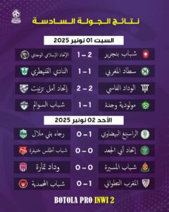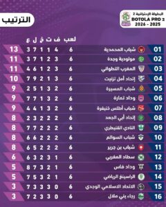 وفي اسفل الترتيب فريقي الاتحاد الاسلامي الوجدي ورجاء بني ملال بثلاثة نقاط.