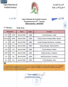 تتواصل هذآ الأسبوع منافسات الجولة السادسة من بطولة الهواة تبجميع الأقسام ، القسم الوطني هواة والقسم الوطني الاول هواة شطر الشمآل والجنوب، والقسم الوطني الثاني هواة شطر الشمآل الشرقي والشمال الغربي والجنوب والصحراء، وستجرى مباريات هذه الجولة ايام السبت والأحد 23 , 24 نونبر 2024.،.