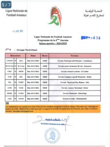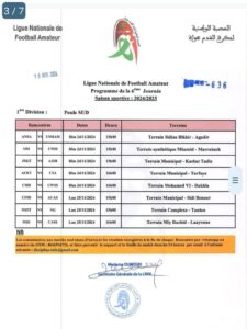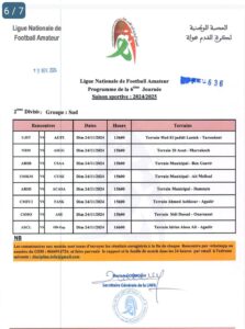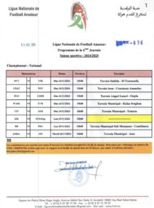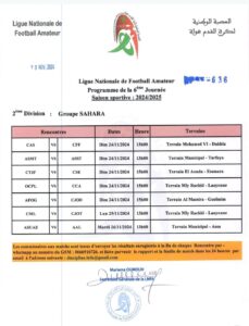تتواصل هذآ الأسبوع منافسات الجولة السادسة من بطولة الهواة تبجميع الأقسام ، القسم الوطني هواة والقسم الوطني الاول هواة شطر الشمآل والجنوب، والقسم الوطني الثاني هواة شطر الشمآل الشرقي والشمال الغربي والجنوب والصحراء، وستجرى مباريات هذه الجولة ايام السبت والأحد 23 , 24 نونبر 2024.،.
