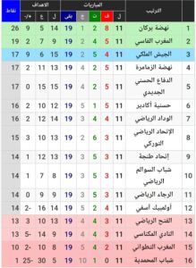 وبعد اجراء الجولة الحادية عشرة، فريق نهضة بركان يحتل صدارة الترتيب برصيد 26 نقطة بفارق 07 نقاط عن مطارده المباشر المغرب الفاسي العائد بنتيجة التعادل الايجابي امام مضيفه النهضة البركانية.