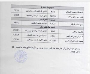 عقدت لجنة المنافسات التابعة للجامعة الملكية المغربية لكرة القدم، برئاسة جمال السنوسي، اجتماعا يوم الأربعاء 25 دجنبر 2024 بمقر الجامعة، لإجراء عملية سحب قرعة إقصائيات الدور الأول من منافسات كأس العرش، برسم الموسم الرياضي 2023/2024، حيث أسفرت عن النتائج التالية وتجدر الإشارة إلى أن مباريات هذا الدور ستجرى يومي الأربعاء فاتح يناير والخميس 02 يناير 2025.
