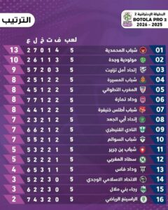 فريق شباب المحمدية يحتل صدارة الترتيب في بطولة القسم الثاني بعد مباريات الجولة الخامسة برصيد 13 نقطة بفارق ثلاث نقاط عن صاحب المركز الثاني مولودية وجدة، وفي المركز الأخير تحتل ثلاثة اندية رجاء بني ملال والراسينغ البيضاوي والاتحاد الاسلامي الوجدي