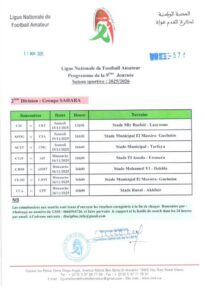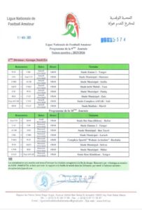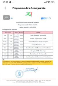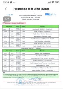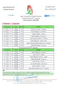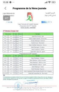 أعلنت العصبة الوطنية لكرة القدم هواة ، عن البرنامج الأسبوعي لأقسام الهواة، الجولة التاسعة من بطولة القسم الوطني هواة، والجولتين التاسعة والعاشرة من بطولة القسم الأول هواة شطر الشمال والجنوب، والقسم الثاني هواة شطر الشمال الشرقي والشمال الغربي والجنوب والجولة التاسعة شطر الصحراء