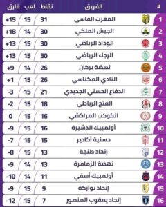 بعد إجراء مؤجل الجولة 12 من البطولة الوطنية الإحترافية بين فريقي المغرب الفاسي والوداد الرياضي، والتي انتهت بفوز الماص بهدف دون رد، أصبحت صدارة الترتيب مؤقتا لفريق المغرب الفاسي برصيد 31 نقطة، بفارق نقطة واحدة عن فرق المطاردة المتكونة من الجيش الملكي والوداد الرياضي والرجاء الرياضي.